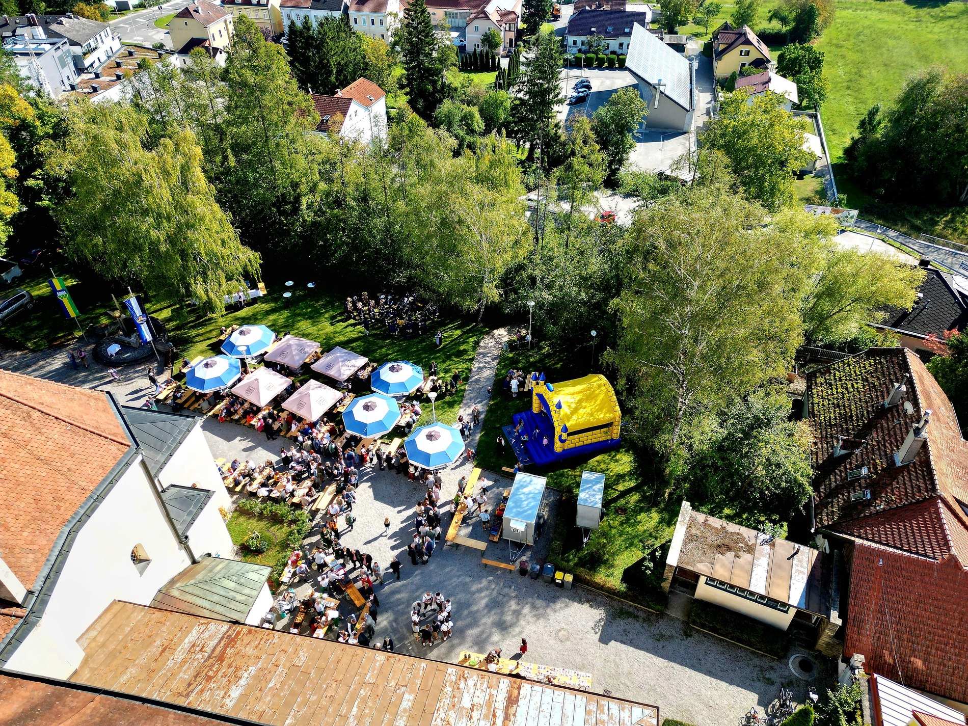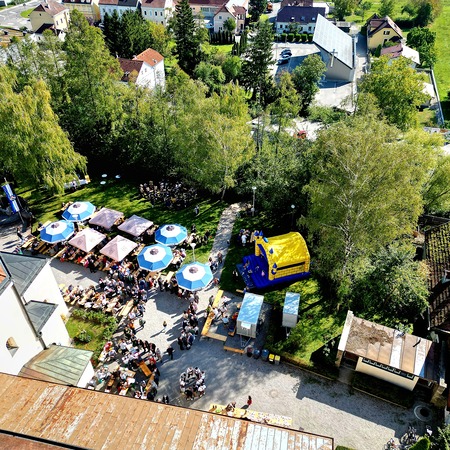 Beim anschließenden gemütlichen Teil vor der Kirche wurden wir mit Kotelettesemmeln, Grillwürsteln, Gemüselaibchen, Kuchen, Kaffee und Pfarrwein verwöhnt, während uns die Stadtkapelle musikalisch unterhielt. Die Kinder konnten sich beim Schminken oder in den Hüpfburgen austoben.